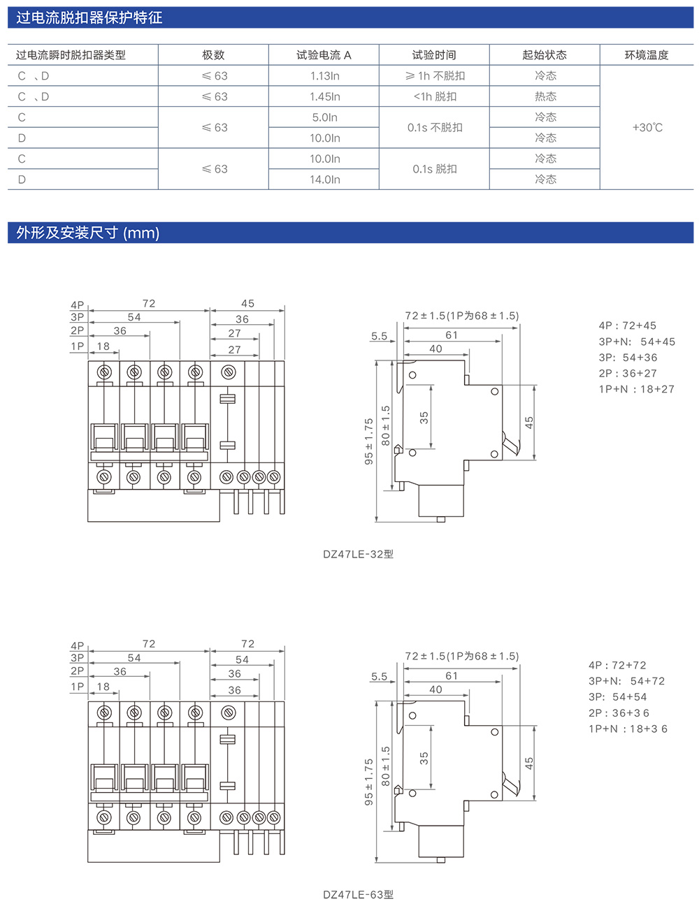 DZ47LE-63 系列漏電斷路器適用于交流 50Hz,額定工作電壓單極兩線、兩極 230V,三極、三極四線、四極 400V,額定電流至 63A 的線路中,用來對人進行間接接觸保護,以及對建筑物及類似用途的線路進行過電流保護。也可對由于過電流保護裝置不動作而持續存在的接地故障引起的火災提供保護。帶過電壓保護的漏電斷路器還能對由于電網故障引起電壓過高進行保護。